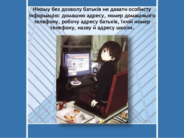 - 1. Нікому без дозволу батьків не давати особисту інформацію: домашню адресу, номер домашнього телефону, робочу адресу батьків, їхній номер телефону, назву й адресу школи.