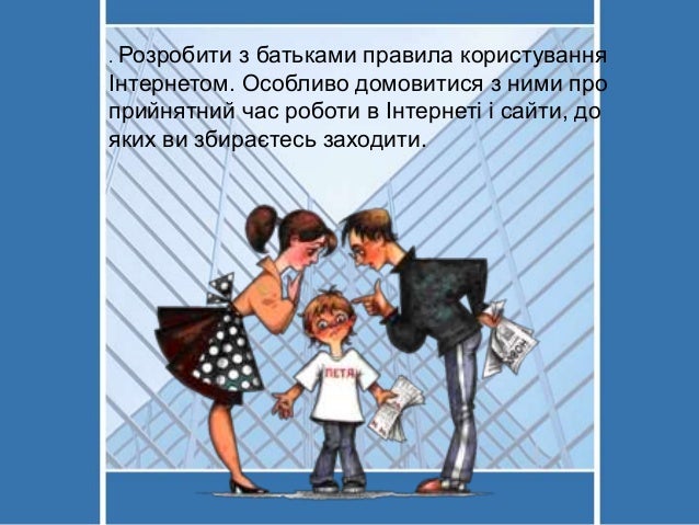 - 4. . Розробити з батьками правила користування Інтернетом. Особливо домовитися з ними про прийнятний час роботи в Інтернеті і сайти, до яких ви збираєтесь заходити.